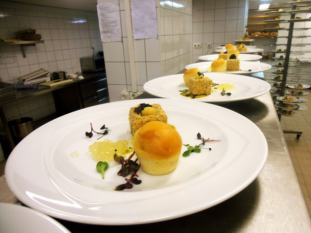 A vacsorát az egri Zsálya Bistro séfje, Meskó Norbert és a Hotel Eger & Park séfje együttesen komponálták és a szálloda konyhájában készítették. Ahogy Madák Lászlóné Etelka, az Egri Borbarát Hölgyek Egyesülete elnöke elmondta, a bálon 240 főre terítettek. Ez a nagyságrend más kihívásokat jelent, mint, amivel egy néhány tucat embert leültetni képes étteremben találkozhatunk.